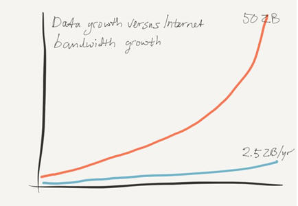 现在,全球的数据量呈指数增长。如果IDC公司的推测成为事实的话,那么在几年的时间里,全世界将存储大约50ZB的数据。另一方面,虽然互联网传输数据的总容量也在增长,但增长速度更为缓慢。在全球数据量增长到50ZB的同一时期,互联网总带宽将达到每年2.5ZB(如果思科的推断成为事实的话)。