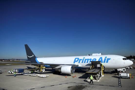 2016年12月,宾夕法尼亚州艾伦镇,一架带有亚马逊Prime标志的宽体飞机在阿伦敦利哈伊谷国际机场卸货。
