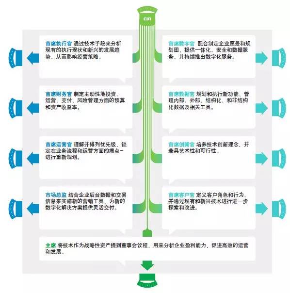 在过去几年中可以看到,各种行业中出现了新的领导角色:首席数字官,首席数据官,首席增长官,首 席科学官,首席营销技术总监兼首席分析官等等。每个角色都与技术的革新密不可分,他们的范围不仅 会与CIO产生重叠,还会与其各自的策略发生重叠。这些新职位映射出了新兴的机会和未满足的需求。 有时候,这些需求会得不到满足,其原因是CIO们还没有提升自身职责来承担新的战略活动。他们这么做 可能是有一定原因的,但这最终会导致企业发展受阻,从而背上历史的包袱。