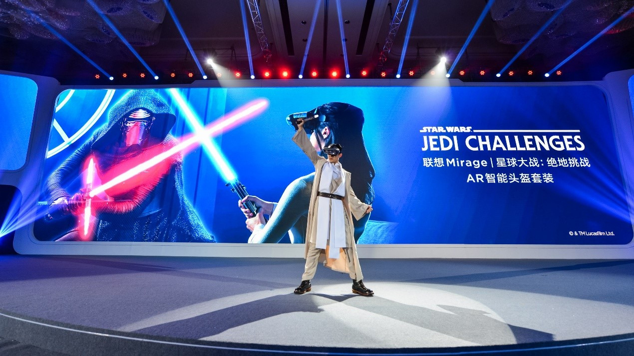 在这一理念下,Mirage AR智能头盔便是联想和全球重量级合作伙伴迪士尼联合开发的首款智能生态产品。游戏内容和概念取材于全球范围内拥有广泛拥趸的“超级IP”星球大战,联想通过技术将现实与虚拟世界连接,用户打开游戏APP适配,再将手机置入眼镜之中,手握光剑,便可瞬间化身为绝地武士,尽兴迎战。