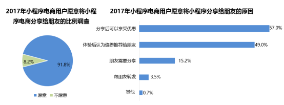 报告中,以蘑菇街小程序电商双十一数据为例,通过微信好友分享达成交易的用户占总成交人数的44%,几乎一半用户来自社交分享行为!单件商品通过快速裂变,在微信端分享人数达11万人,呈几何倍数增长提高电商运营效率。