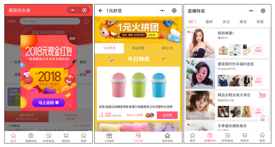 小程序电商是有待开发的宝地,既能为电商从业者带来流量,也能满足消费者购物所需的趣味要求。以蘑菇街小程序电商为例,平台摸索出了各种创新玩法,如千人直播、1元拼团、0元试穿、社交立减金等玩法,“聊出订单、玩出订单”,增加消费者与商家、消费者与朋友的购物链接,为商家沉淀“粉丝”。