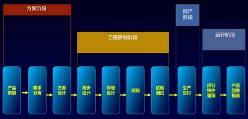 进入第二个阶段的工程研制。就是初步设计、详细设计、试制、实验测试,反复迭代;直至完成设计定型和生产定型。然后进入第三个阶段,就是开始批产和批量交付;交付完之后进入第四个阶段:运行维护维修和回收报废。