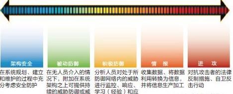 SANS研究所的Robert M. Lee提出了一个动态安全模型——网络安全滑动标尺模型。该标尺模型共包含五大类别,分别为架构安全(Architecture)、被动防御(Passive Defense)、积极防御、情报(Intelligence)和进攻(Offense)。这五大类别之间具有连续性关系,并有效展示了防御逐步提升的理念。