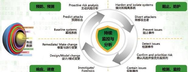 自适应安全架构将持续的监控和分析过程分为:预防预测、阻止与防护、检测与监控、响应与调查四个主要环节,每个环节中包含多个监控和分析方法。而支撑这些监控和分析方法的是企业或组织内部的各层数据和威胁情报。