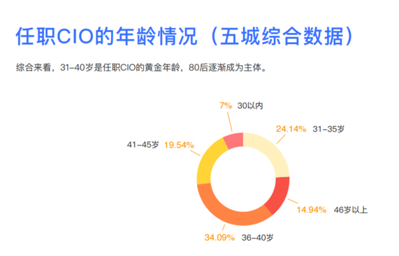 分区域对比来看,杭州35岁以下的CIO占比达50%,为五城中最高,这说明杭州人才机构更年轻,同时中小型公司众多可能也是CIO年轻的原因之一。上海、广州、深圳三城中36-40岁时任职CIO数量居多。相比于其他四个城市,北京CIO任职时年纪偏高。数据显示,北京有40.82%的CIO任职时年龄在41-45岁之间。