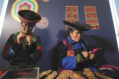 来自青海的土族阿妈祁生敏介绍,土族盘绣,因做工精湛,针法独特,具有很高的美学和收藏价值。但碍于做工费时又费力,加之原始成品缺乏实用性和时尚感,过去多拿到旅游景点处进行零售。也因此,很多年轻的土族女子放弃了这项技艺,在农闲季节选择外出打工。