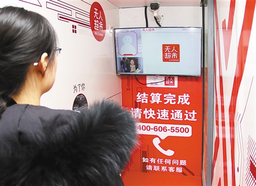 2017年12月30日,在京东无人超市山东烟台大悦城店,顾客通过智能结算通道“刷脸”付款。