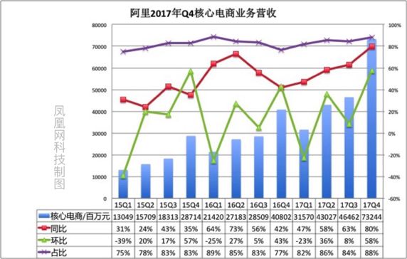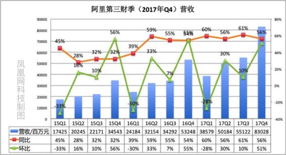 2月1日晚间,阿里巴巴公布了2018财年第三财季业绩,过去的2017年最后一个季度,被阿里CEO张勇认为是“公司历史上最好的季度之一”,营收达830.28亿元,同比增长56%,这也是阿里连续第七个季度在营收增长上保持超过50%。