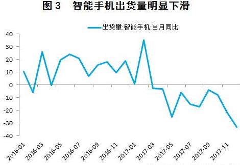 值得一提的是,男士们购买手机等数码产品今年又有了新变化——平衡车、无人机和全画幅微单等黑科技潮流产品在苏宁易购年货节的销售增速达到了170%,成为90后热衷的新年货。与此对应,智能手机出货量增速明显下滑(参见图3)。