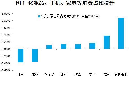 观察每年1季度的零售额占比变化,可以发现年货消费结构变迁——近三年来,服装、金银珠宝首饰消费占比稳步下降,但化妆品、手机、家电、家具和汽车占比不断攀升(参见图1)。通俗点说,人们已经不再满足过年穿新衣、戴新首饰,渐渐地开始在新年置办心仪物件,让自己和生活变得更有质感。