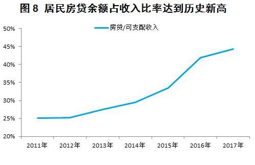 从居民房贷余额与可支配收入的对比来看,2017年居民的房贷余额占可支配收入的比例上升到了历史最高位——从2013年的27%提升至2017年的44%(参见图8)。可以想象,当房价的潮水退去,只剩下一群还着巨额房贷的人在裸泳。
