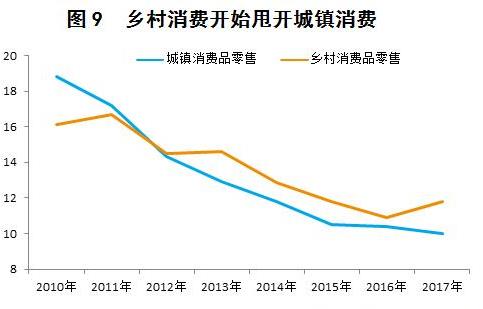 其次,农村消费增速开始超过城镇。从社会消费品零售总额增速看,2017年乡村消费品零售增速开始甩开城镇消费品增速——2017年乡村消费品增速反弹至11.8%,但城镇消费品增速下滑至10.0%(参见图9)。
