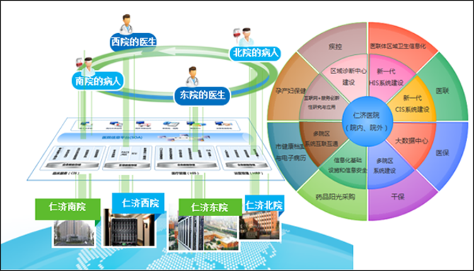 仁济医院建于1844年,是一所集医疗、教学、科研于一体的三级综合医院。作为一家百年老院,仁济医院在2011-2013年经历了大跃进式的快速发展,从东、西两个院区扩展到目前的由东南西北四个院区和上海市肿瘤研究所组成的多院区医院。随着医院的院区不断扩张,就医患者迅速增加,如何改变四个院区信息系统割裂、患者跨院区就医信息同步难、就医体验不佳等现状,成为了医院必须解决的问题。对于年门诊量约430万人次的仁济医院来说,医院的信息化系统是关系到无数患者生命健康的大事,这就要求医院的软硬件平台必须保障每一条迅速、可靠、完整地在各个区及子系统中传递。