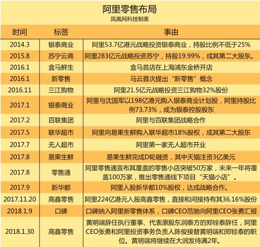 被阿里内部在商超新零售领域视为“一号工程”的盒马鲜生,自2016年1月首家店在上海金桥店开业之后,发展迅速,目前已在全国7个城市开出了25家门店,并称将在2018年在北京再开出30家门店;随后,阿里先后入股了区域性零售企业三江购物、联华超市、新华都;2017年11月20日,阿里224亿港元直接和间接持有高鑫零售36.16%的股份,拿下欧尚和大润发。