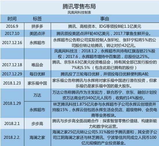 2017年12月16日,腾讯42.15亿元获得永辉超市5%股份,使永辉超市旗下的超级物种成为盒马鲜生的最强对标选手,双方竞争进入白热化阶段;一个多月后,公告称腾讯与永辉超市将对家乐福中国进行潜在投资;6天后,万达、永辉超市、海澜之家先后被腾讯重金投入;2月1日,腾讯与步步高展开了全面的战略合作。