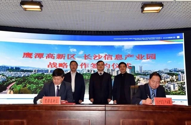 2月6日讯,今日,江西鹰潭高新区与长沙信息产业园签订战略合作协议。鹰潭市委常委、副市长李唐,鹰潭高新区党工委书记李卫国、管委会主任杨鹏,长沙高新区管委会主任谭勇、管委会副主任莫一平参加签约仪式。