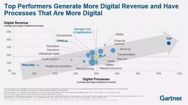 至于数字化企业的概念,陈勇表示,Gartner设定了一些指标,从销售收入(如通过数字化手段实现的销售收入占比)、数字化的渠道、数字化的产品、数字化的服务等多个维度来进行衡量,并且跟行业的平均水平进行比较,评判企业达到了什么样的水平。Gartner不会定义某个企业就是数字化企业,某个企业就是非数字化企业。