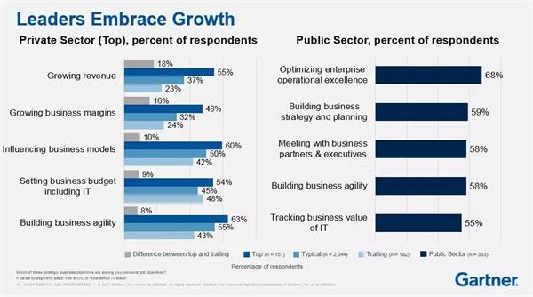 2017年参与调研的CIO人数为3160位(其中有75位来自中国),覆盖了98个国家和地区,覆盖了制造(21%)、政府(15%)、金融(11%)、服务(11%)、教育(10%)、保险(5%)、零售(5%)以及采矿、交通、健康、能源、媒体、电信、贸易、健康保险等行业。参与调查的这些公司总销售收入为13万亿美元,IT支出是277亿美元。
