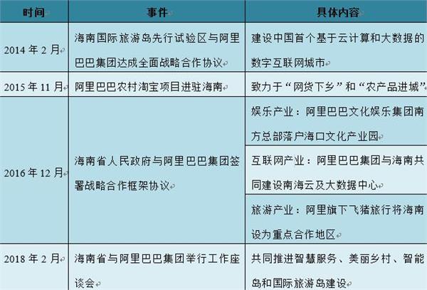阿里巴巴集团与海南省渊源颇深。早在2014年,阿里巴巴集团在三亚决定全面实施大数据战略,投资50亿落子“智慧城市”,与海南国际旅游岛先行试验区达成全面战略合作协议;2015年阿里巴巴农村淘宝项目进驻海南,覆盖海南省60%市县;2016年,阿里巴巴集团与海南省人民政府签署战略合作协议,加强在互联网产业、旅游产业和经济产业转型升级等领域的合作。