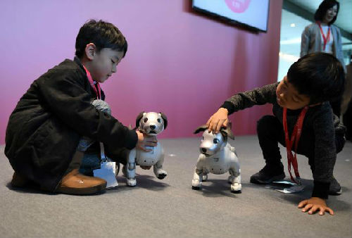 1月11日,在日本东京,孩子与机器狗“爱宝”(Aibo)互动。索尼公司在狗年来临之际发布了新一代机器狗“爱宝”,新款产品使用人工智能技术并具备联网功能。
