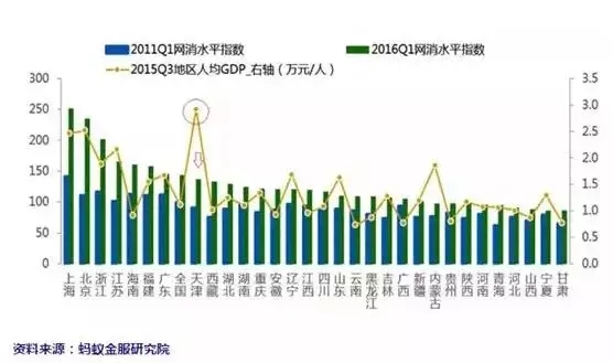 网购是通过网上支付来实现交易的,因此,网购获得的统计数据,相比百货、超市或专卖店的消费数据,应该更为真实。记得2016年年中的时候,蚂蚁金服研究院曾公布过网购数据(通过支付宝),这对于比较全国各个省市之间的经济发达程度、居民收入水平倒很有借鉴意义。