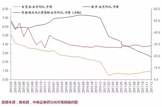国内网购起步发展的时间大约在2011年。由于商务部公布的网购数据要早于统计局,且公布的频率较高,故下图采用商务部的相关数据。数据表明,在2013年之前,国内主要超市、百货的销售额年增速都在10%以上,2013年之后就开始下行。根据国家统计局的数据,2017年全年,限额以上零售业单位中的超市、百货店零售额比上年分别增长7.3%、6.7%,但商务部统计的重点流通企业销售额数据要比国家统计局低一半以上。