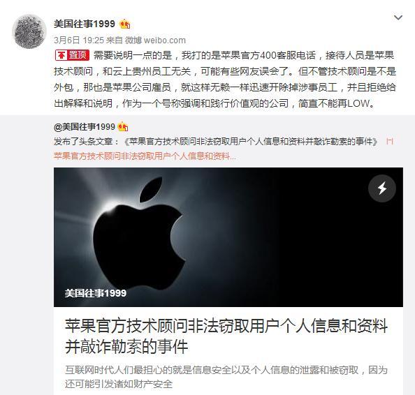 不过,近日苹果产品的安全性却遭到了用户质疑。微博网友@美国往事1999发文称,自己在将iCloud转由云上贵州服务的第一天,就发生了苹果官方技术顾问非法窃取用户个人信息和资料并敲诈勒索的事件。