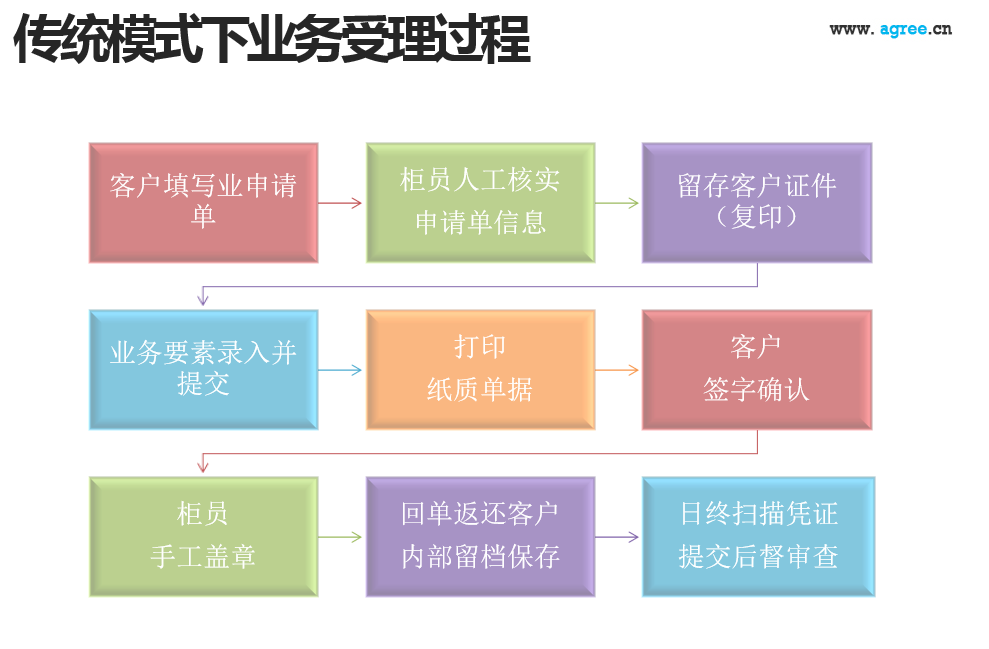 运营无纸化与传统的银行网点业务办理模式区别在于:传统的银行网点业务环节对人工操作的依赖很严重,比如客户证件的复印留存,凭证盖章时的用章申请及保管收纳,都需要人工进行处理,一方面大大降低了业务办理效率,一方面也给业务办理带来许多不可规避的风险。