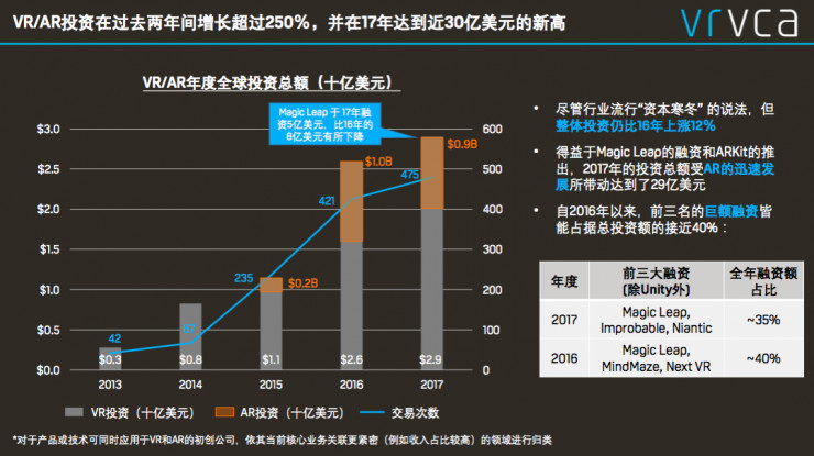 虽然2016年下半年盛行“VR寒冬”论,但是数据显示2017年VR /AR全球投资金额达到30亿美元新高,比2016年上升12%,比2015年增长近3倍;
