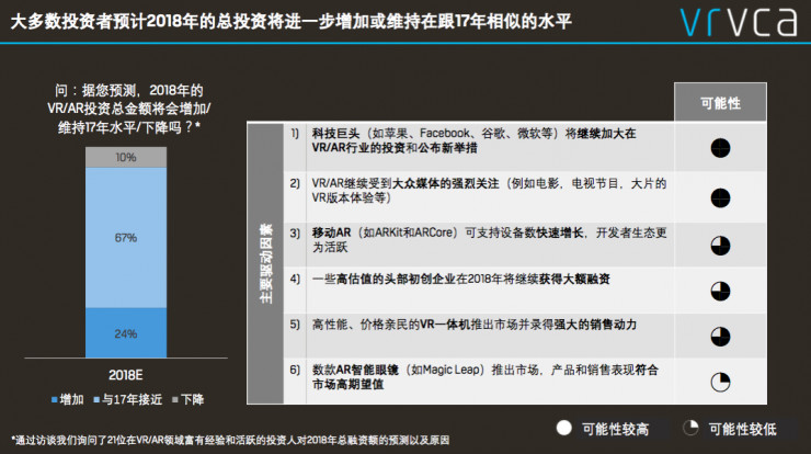 总的来说展望2018年,近90%的投资人认为今年VR、AR行业的投资总额将有望与2017年的整体水平持平甚至更高。报告认为,伴随更低准入门槛的VR/AR一体机在消费市场的普及、下一代PC VR设备带来的企业解决方案的升级、智能手机AR解决方案对沉浸式技术发展的促进以及未来可支持“VR/AR云”的全球5G网络的部署,新的投资机会或将不断涌现。