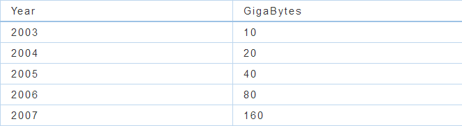 回到本世纪初,麻省理工学院的一个很大的实验室(CSAIL),需要给超过90家研究小组筹集研究经费,试图通过iPod内存的快速增长向赞助商说明世界在进行快速的发展。跟摩尔不一样的是有5个数据点!通过5年的观察,在每年6 – 9月会有新的机型发布,具体的数据是关于400美元可以给iPod提供多大存储。数据如下: