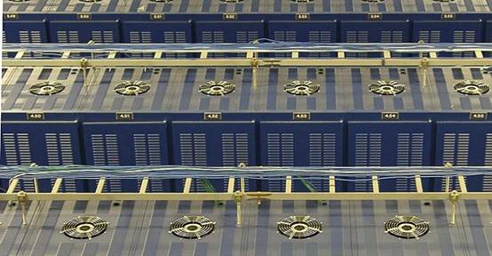 飓风电气公司的Fremont1数据中心内的机柜和电缆桥架俯视图