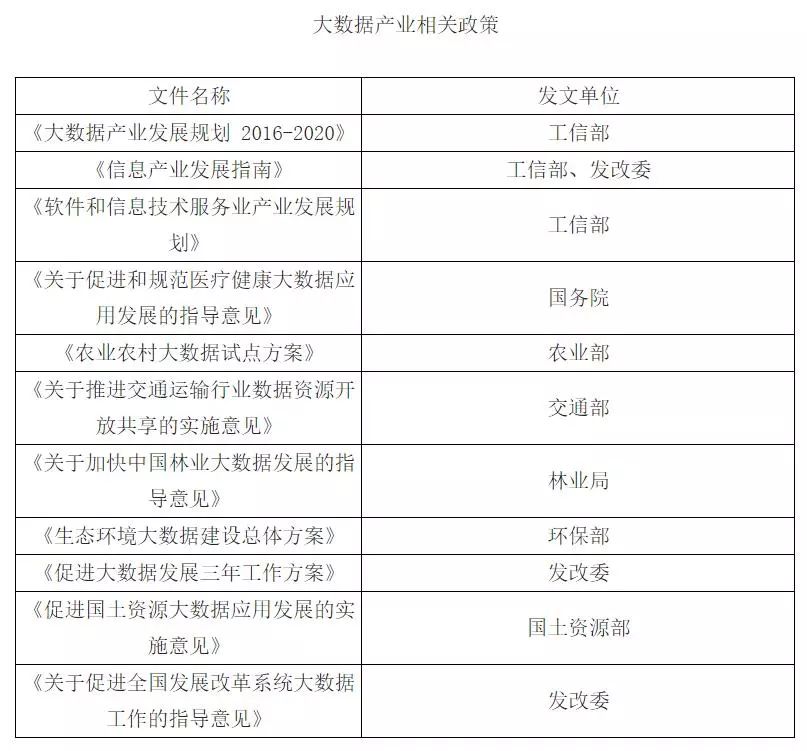 2016年以来,国家政策持续推动大数据产业发展。2016年“十三五规划”中明确提出实施大数据战略,把大数据作为基础性战略资源,全面实施促进大数据发展行动,加快推动数据资源共享开放和开发应用,助力产业转型升级和社会治理创新。发改委、工信部及农业部、运输部等部委先后颁布相关后续政策,推动大数据产业发展。随着大数据产业的进一步落地,预计未来将有更多部门出台具体政策,推动大数据行业的发展。