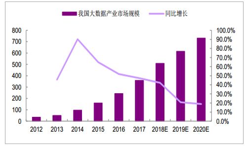 在国家政策持续推动下,大数据产业落地进程加快,产业价值被进一步发掘。2017年我国大数据市场规模已达358亿元,年增速达到47.3%,规模已是2012年的35亿元的10倍。预计2020年,我国大数据市场规模将达到731亿元。