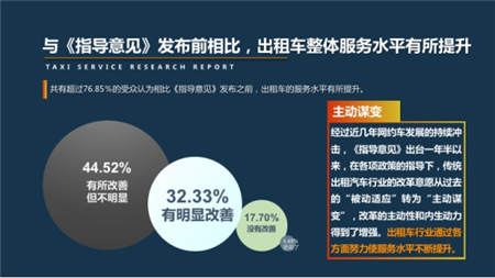 这一多达123611名用户参与的调研结果显示,有超过76.85%的受众认为,与《深改指导意见》发布前相比,出租车整体服务水平有所提升,其中32.33%的受众认为改善很明显。这真真切切地证实了出租车行业发生的积极变化,已经得到了广大乘客的认可。