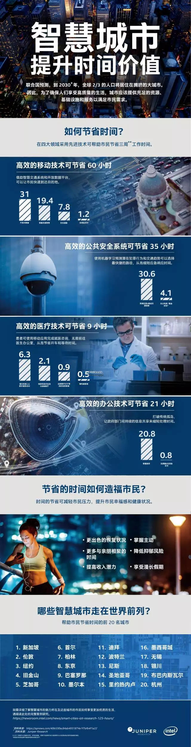 这项由英特尔赞助的Juniper Research调查预测,通过在四大领域采用先进技术,智慧城市每年可为每位居民(累计)节省125小时——这可是三周的工作时间。而调查涉及的许多物联网技术,包括出行、健康和公共安全解决方案,都已在世界各地悄然部署。