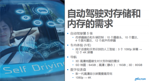 美光嵌入式产品事业部中,未来一个很大的增长领域将是自动驾驶。Kris Baxter先生称,目前汽车领域已经有很多新特点和新功能出现,例如高级驾驶员辅助系统(ADAS)、车载娱乐系统功能等。