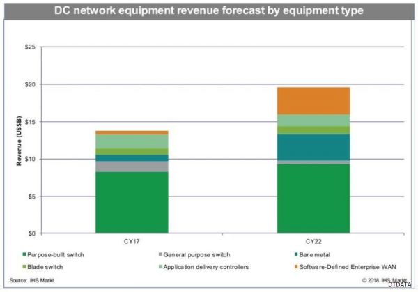 根据IHS Markit的最新调查数据,2017年数据中心网络设备收入总计为137亿美元,比2016年增长了13%.该分析公司预测,到2022年,市场将增长到196亿美元,其中裸机和软件定义的广域网(SD-WAN)收入增长最快。