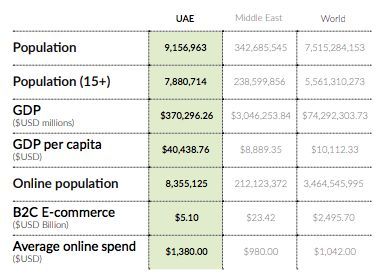 阿联酋网民数量约835万,人均线上消费1380美金。