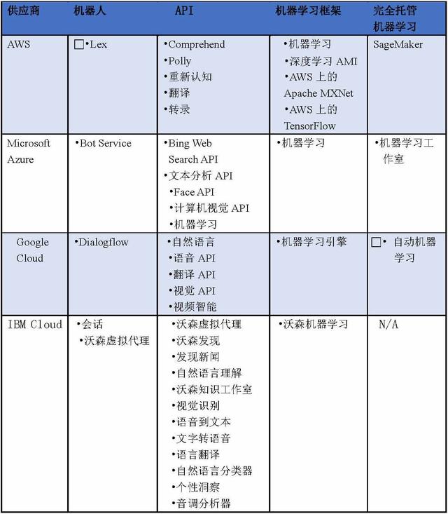 所有领先的云计算供应商都提供人工智能即服务,而一些小型供应商也提供基于云计算的人工智能服务。以下进行一下概述: