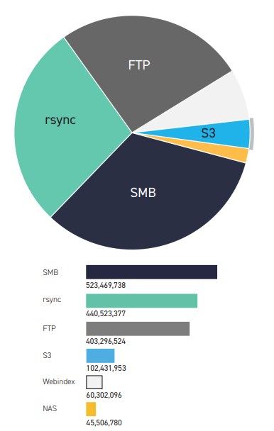 其中来源于 Amazon S3 Bucket 的占了7%,SMB 占了 33%,Rsync 占了28%,FTP 占26%。