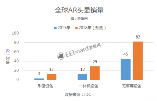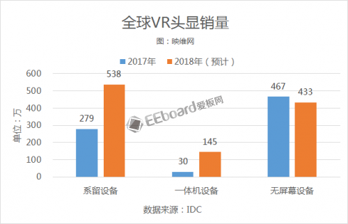 IDC报告预计,2018年系留VR设备销量有望达到538万,一体机VR设备有望达到145万,无屏VR设备将减少到433万,系留AR设备销量有望达到12万,一体机AR设备有望达到29万,无屏AR设备约82万。