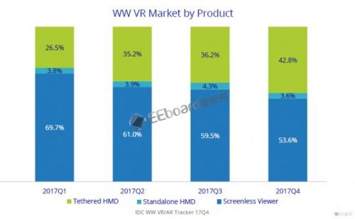 根据报告,2017年系留VR设备的市场份额不断扩大,并连续四个季度压榨无屏VR设备的市场空间,而一体机VR设备则一直维持一个比较稳定的市场空间。