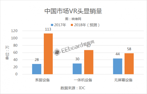 针对中国市场,2017年VR头显销量约102万,相比2016年减少了18.7%,其中无屏设备减少了49.6%。IDC报告预测,2018年中国VR头显市场销量系留VR设备有望达到113万,一体机VR设备有望达到67万,无屏VR设备有望达到58万。