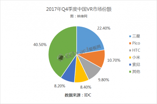 根据IDC的报告,2017年中国VR市场,三星VR头显以约22万套的销量取得最高,第二是销量约12万套的小米VR,第三是约10万套的HTC,第四是约8万套的Pico,第五是约7万套的索尼和大朋VR。IDC还表示,得益于价格实惠的一体机设备,Pico实现了四个季度的连续增长,并在2017年第四季度以10.7%的份额占据第二。