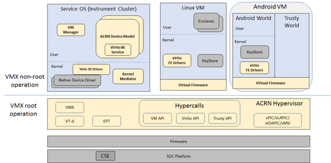 ACRN是一个专为嵌入式设备设计的hypervisor,包括如下两部分:一套hypervisor的参考软件和架构,通过虚拟机监视器(Virtual Machine Manager)可以在同一个物理硬件上安全地同时运行多个操作系统。另外,它还为设备虚拟化模拟定义了一套参考设计框架,称为“ACRN设备模型”。