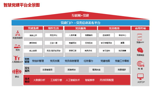 智慧党建是将基层党建工作“管理精细化、工作规范化、服务感知化、过程透明化、结果数据化”,真正运用如云计算、大数据、智能机器人等各种互联网新技术融入党建工作中,为从而全面提升党组织工作效率和水平。