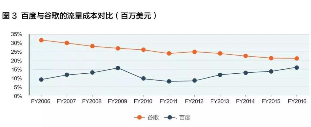 智能手机的普及阶段,为我国互联网带来的红利是,庞大的未开发市场和极低的流量成本。图 3显示的是百度和谷歌流量成本占其在线广告业务的比重,可以发现,在成熟国家市场,互联网企业的流量成本与线下企业相比,并没有特别突出的优势。
