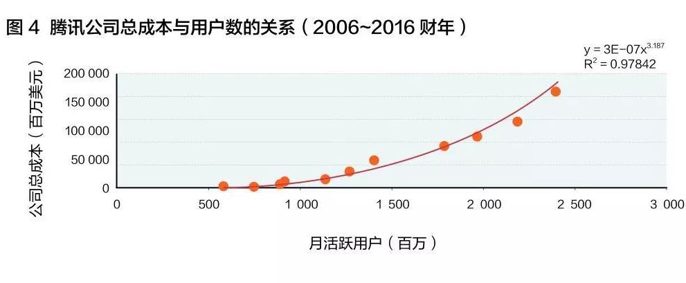 虽然互联网企业在收益上具有网络效应,边际成本极低,但别忘了另一个对企业收益有重要影响的指标——企业总成本。以腾讯公司总成本和月活跃用户数据进行拟合,如图 4所示,公司总成本(y)与用户数量(x)的3.18次方呈正比,用户数带来的总成本提升,甚至超过了对公司市值的提升作用。